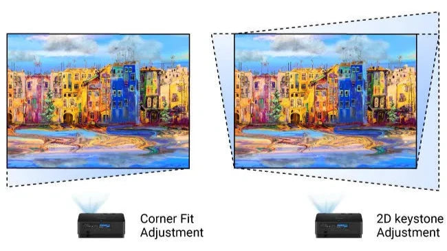 Flexible Setup: Features 2D Keystone, Screen Fill, and Corner Fit for easy adjustments.