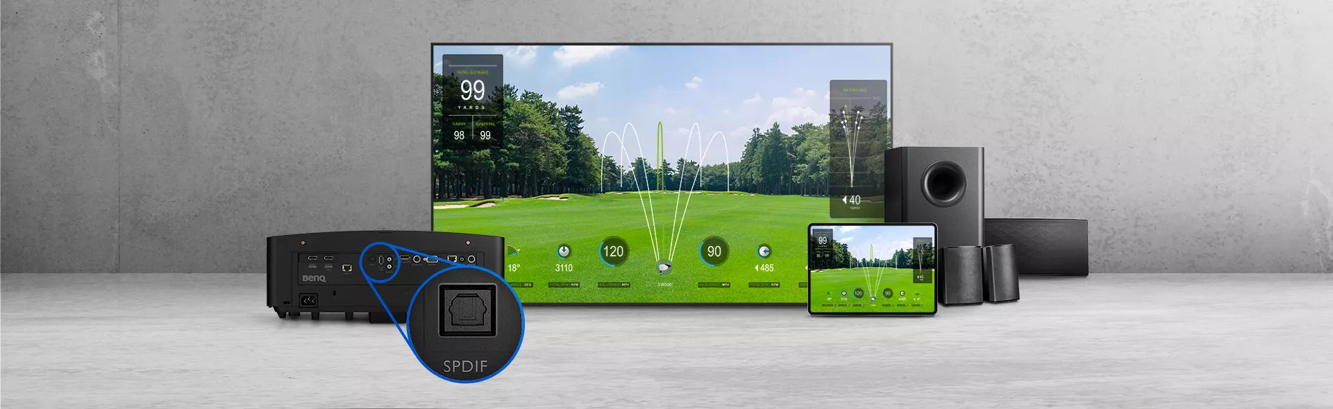 Maximize your simulator space with a short throw ratio of 0.81 ~ 0.89, projecting a 12-foot-wide image from less than 10 feet, allowing you to stand closer to the screen without casting a shadow.